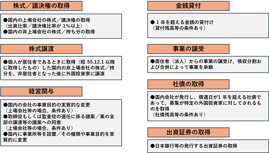 対内直接投資にあたる類型は様々ですが、概説すると以下のとおりとなります。