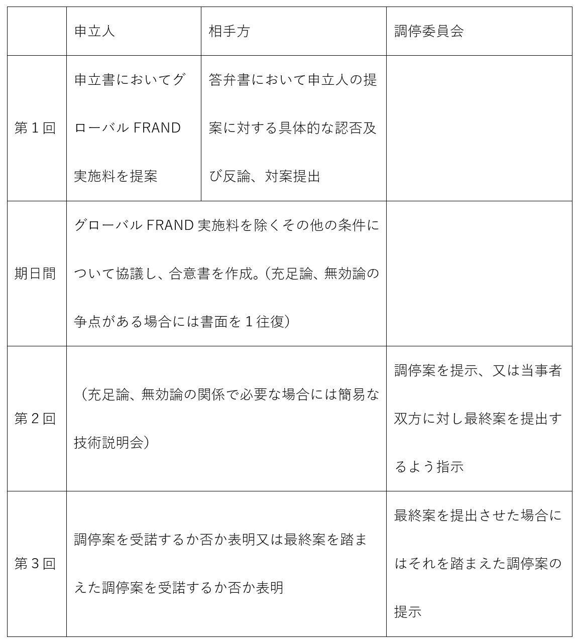 申立人(SEP保有者)は、申立書において算定根拠を具体的に明示した上で、グローバルFRAND実施料を提案しなければならず、相手方(SEP実施者)は、答弁書において申立人(SEP保有者)の提案に対する具体的な認否及び反論を行うとともに、グローバルFRAND実施料に関する対案を提出し、さらに相手方(SEP実施者)製品等の販売数、販売額等に関する証拠も併せて提出する必要があります。この点は、新SEP訴訟における和解手続とほとんど同一といえます。また、充足論及び無効論が補充的な位置付けとなっていることも新SEP訴訟と同様であり、争点がある場合には主張立証の書面を1往復することが想定されています。